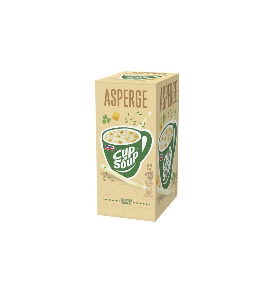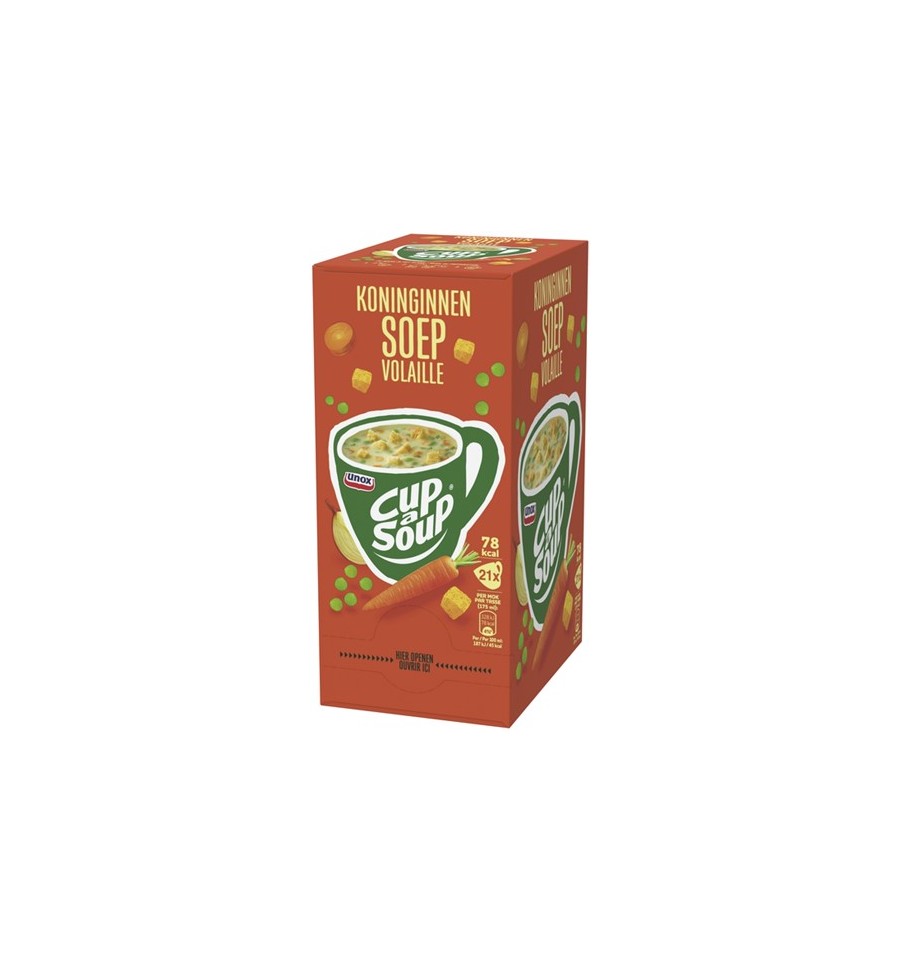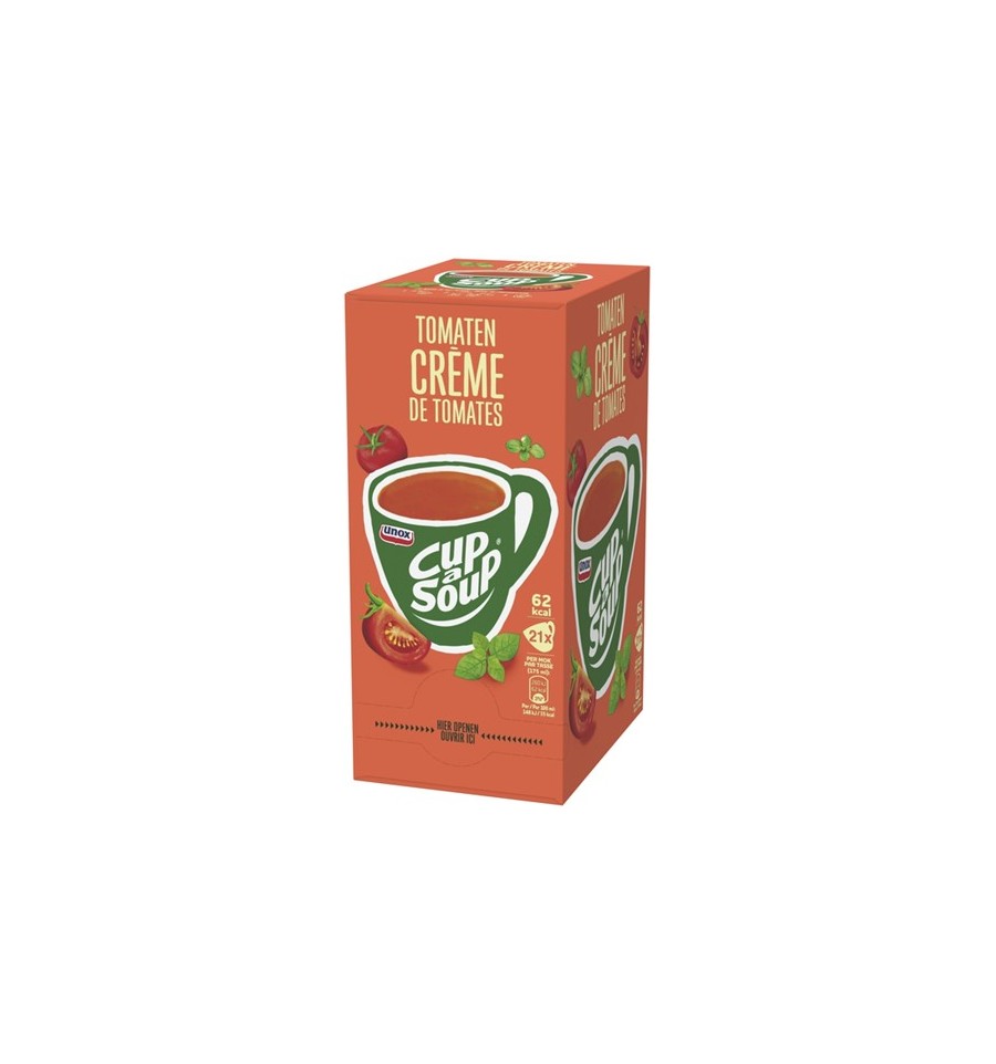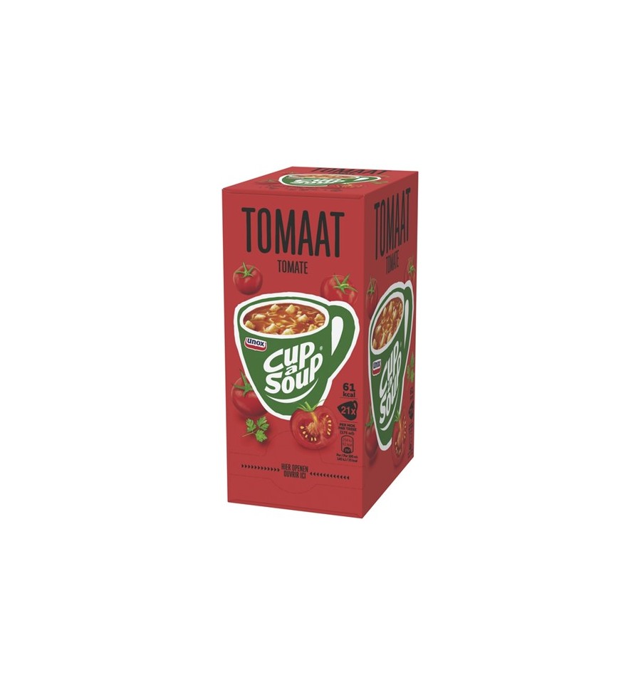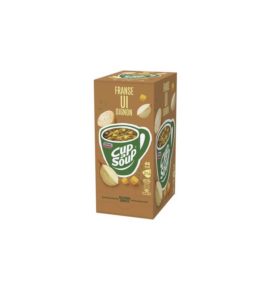 Cup-a-Soup Champignon, verpakking à 21 zakjes van 14,8 gram. Één zakje is voldoende voor een portie van 175 ml.