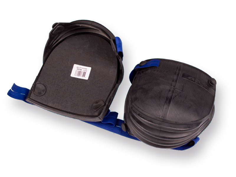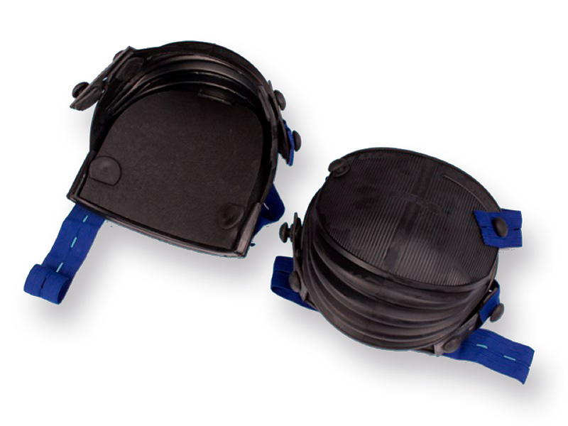 Kniebeschermers gemaakt van rubber. Type Harmonica, kort model nr. 13-V met 4 vouwen. Merk GRIPLINE. Voorzien van twee blauwe Elastische riemen conform Dinnorm EN14404 en vervangbaar kussen. Riempjes elastiek en rubber, knoppen groot en klein zijn voor dit model verkrijgbaar.