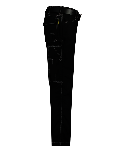 Deze canvas werkbroek heeft drievoudig gestikte naden, een hamerlus, een dijbeenzak welke aflsuitbaar is, en een duimstokzak. De dubbele zoom zorgt voor ongeveer 6 cm lengte.