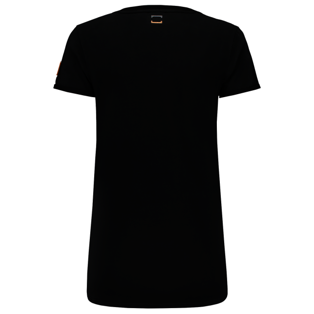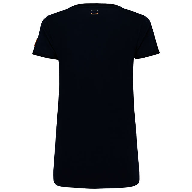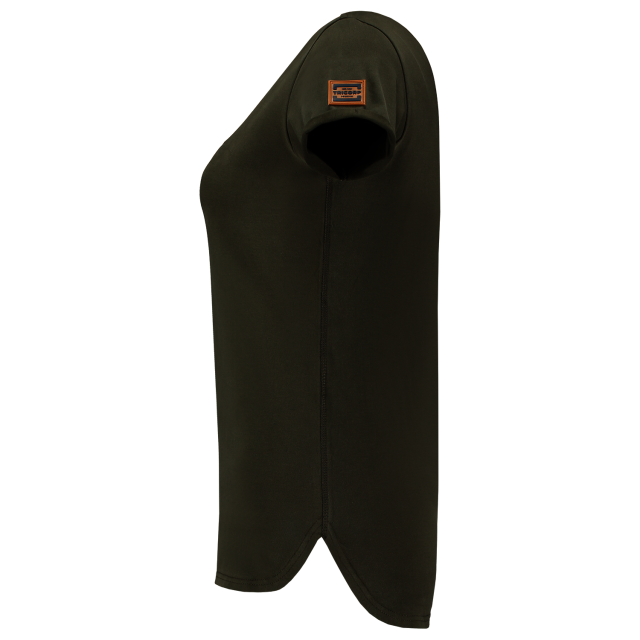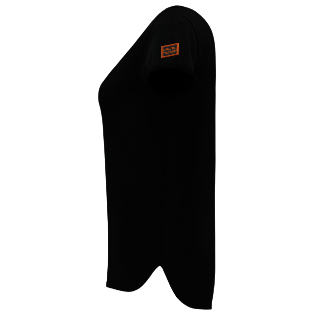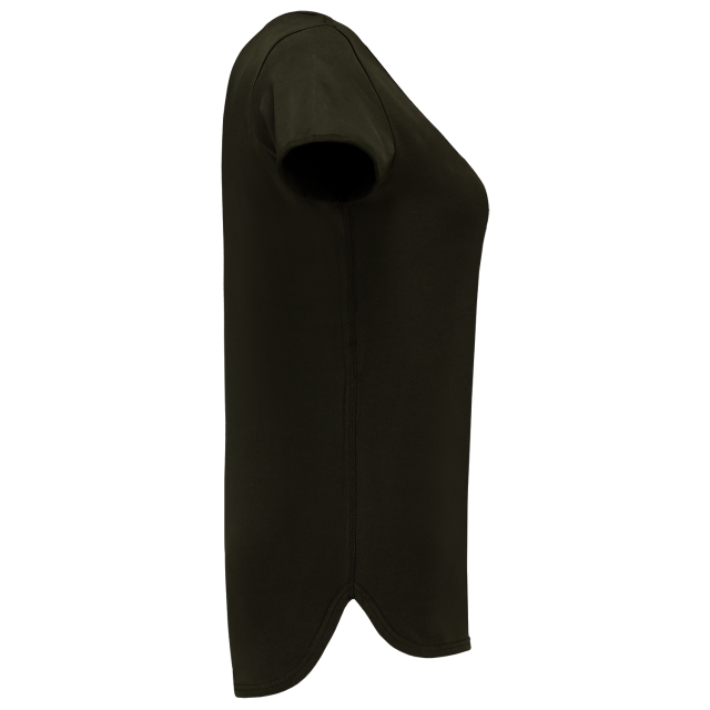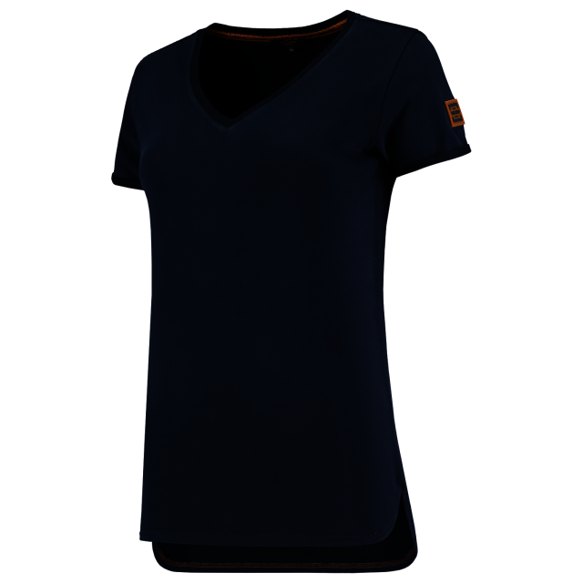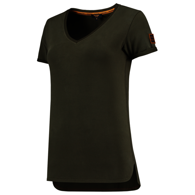 De slanke V-hals en eigentijdse pasvorm van dit T-shirt bieden een modieuze uitstraling aan je outfit. De omgeslagen mouwen zorgen voor een vrouwelijkere uitstraling. Dankzij de vervaardiging uit gekamd katoen en elastaan blijft de pasvorm van dit shirt altijd mooi. Tevens zorgt het elastaan voor extra draagcomfort. Premium T-shirts hebben allen een peach finish, wat ervoor zorgt dat het product rijker aanvoelt.