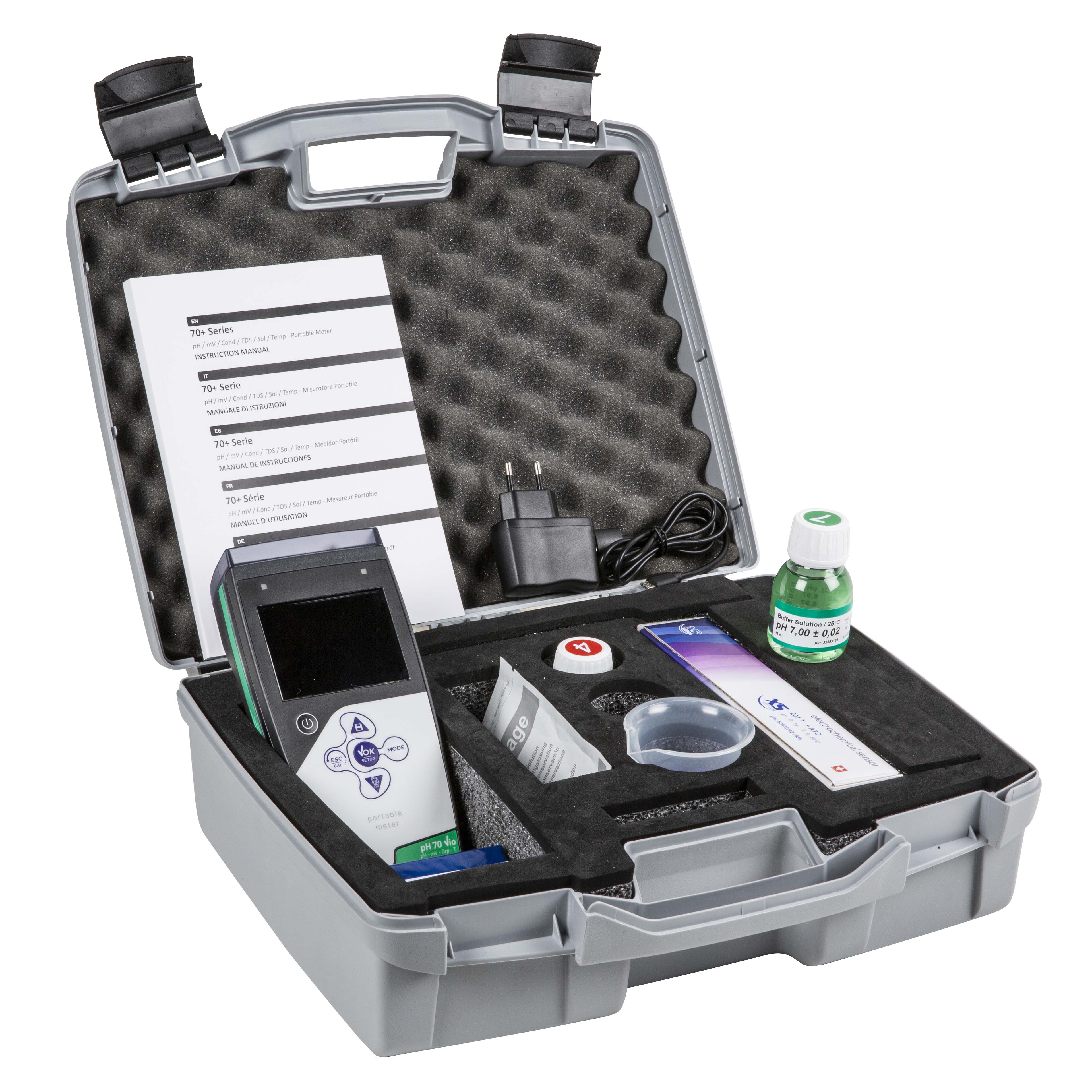 De pH-meter wordt geleverd in een kunststof koffer, inclusief pH elektrode 201T met interne temperatuur sensor en BNC aansluiting, buffervloeistof pH 4 en pH 7, monsterpotje, 1.5 Volt AA batterijen (3x), USB kabel en handleiding.