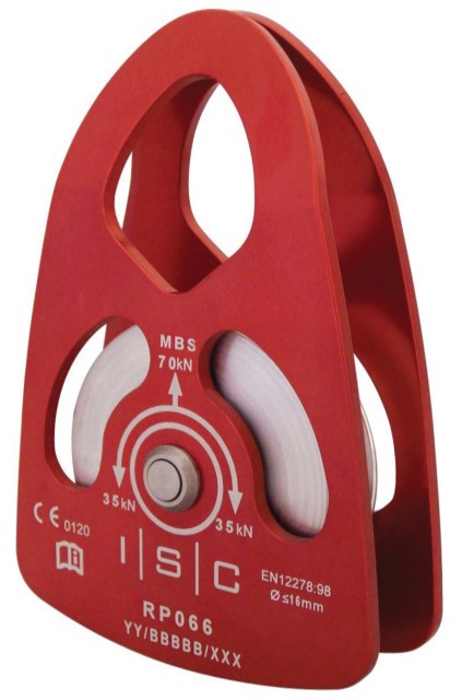 Middelzware lichtmetalen afvangkatrol met lichtmetalen schijven voor afvangwerk. Evenals bij de zware aluminium ISC katrollen zijn de flenzen draaibaar. De katrol kan met behulp van een karabijnhaak worden opgehangen aan de vangstrop.