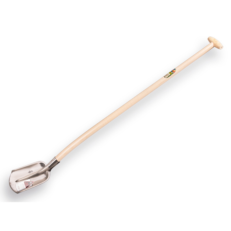 Steekbats of panschop met gehard en gepolijst blad, dulstand 1/4 half gebogen, bladmaat 000, compleet met een gebogen Atlas steel van 110 cm met sterke doorgestoken hilt, merk blad Ruhr Brillant. Atlas schopstelen zijn extra sterk, ze worden in kokend water gebogen waardoor de nerf met de bocht meeloopt.