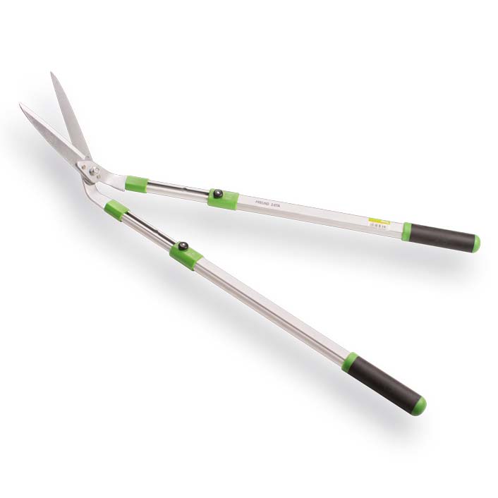 Graskantschaar of kantenknipper met gesmede hardverchroomde messen, voorzien van aluminium grepen, uitschuifbaar in 7 standen van 64 tot 102 cm, verticaal snijdend.