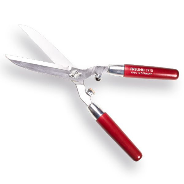 Professionele heggenschaar met een totale lengte van 56 cm, voorzien van een aanslagdemper van hout en rubber en hardverchroomde messen.