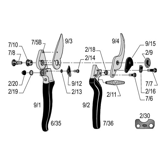 Snoeischaar Felco 9, ergonomisch model met gehoekte snijkop voor linkshandig gebruik.