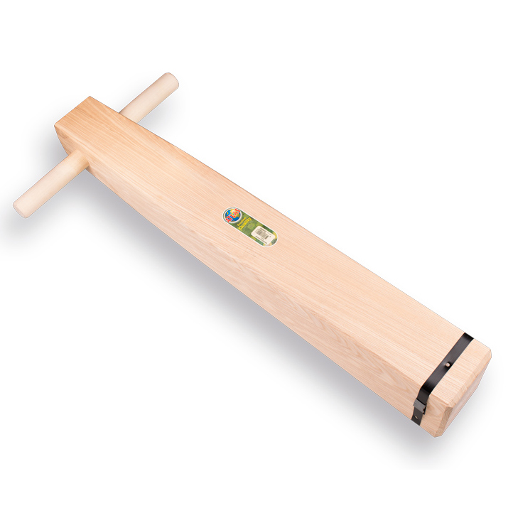 Stalen bandenstamper of grondstamper met een hardhouten klos van 15 x 15 cm, voorzien van een buis handgreep van 40 cm breed, de totale lengte is 84 cm, merk De Wit.