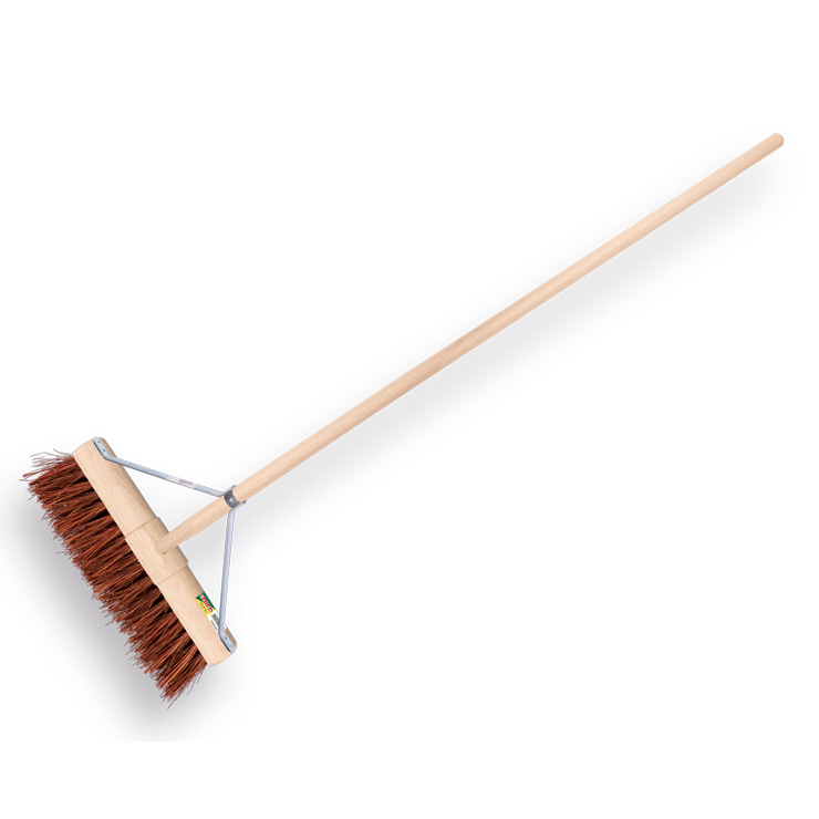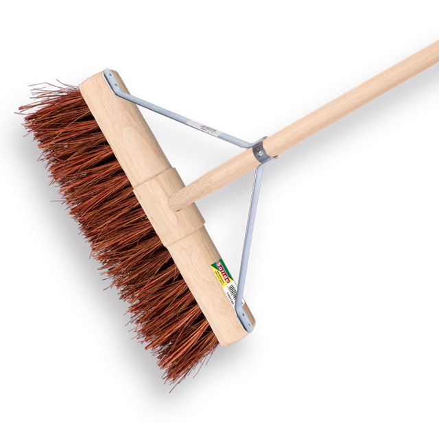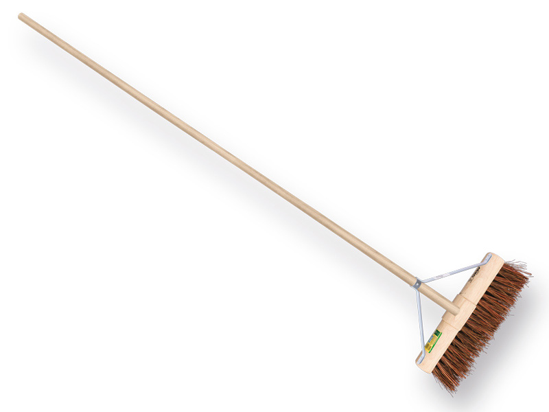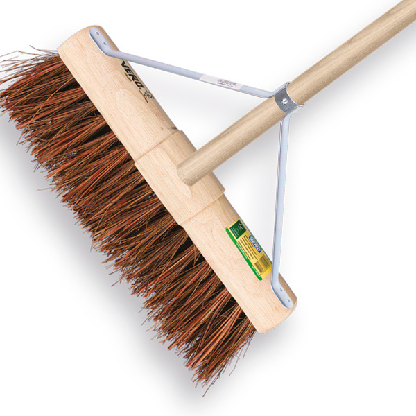 Stadsbezem, straatbezem of wegenbouwbezem 45 cm, compleet met steel en brede stokhouder waardoor de bezem extra stevig vast zit, gemaakt van Bassine en Stalks vezels, breedte 29 cm, vezellengte 13 cm, merk Vero. Bassine vezels zijn vezels gemaakt van de palmyrapalm, ze zijn stug, sterk en veerkrachtig. Stalks vezels zijn vezels gemaakt van gespleten rietstengels, deze zijn stug en hard.