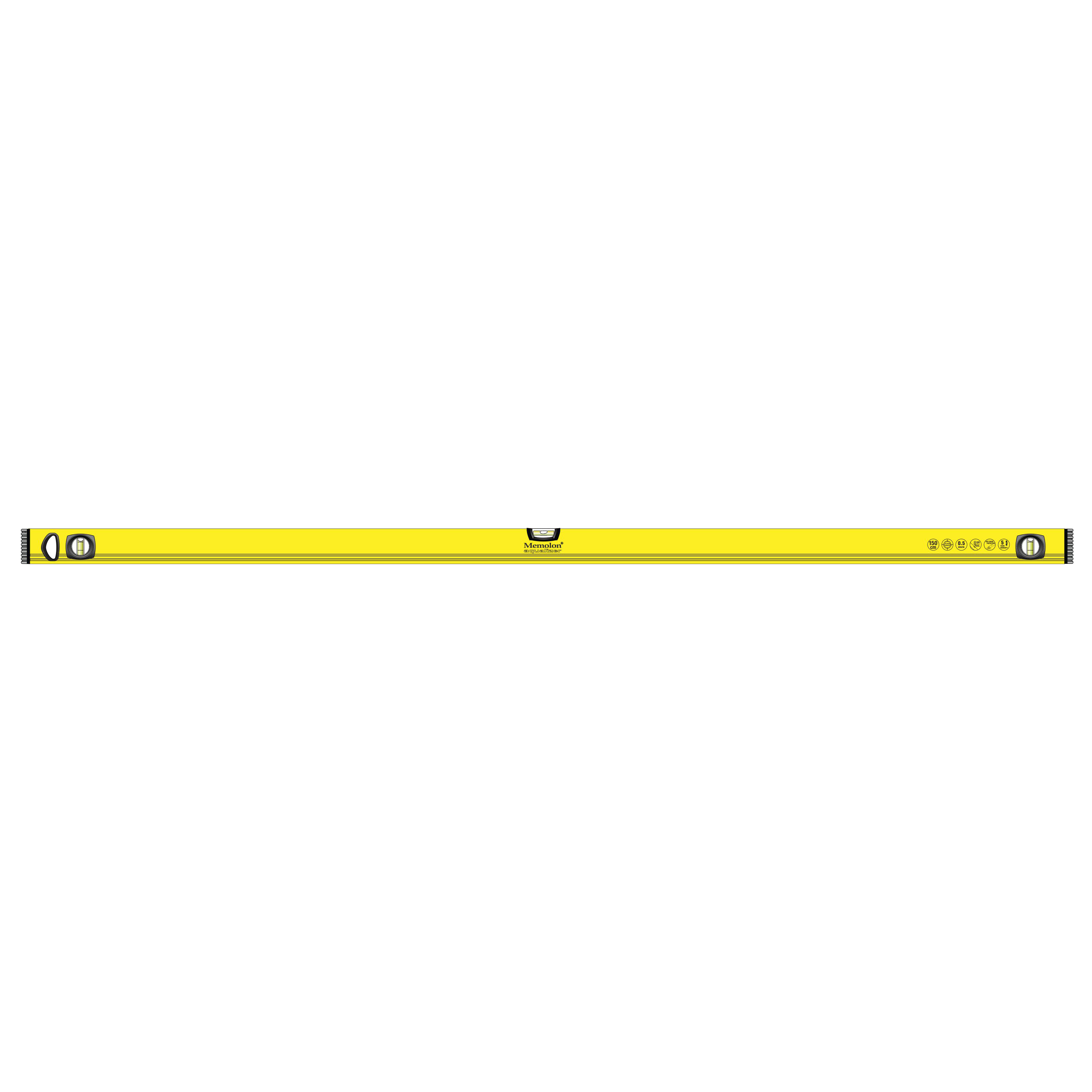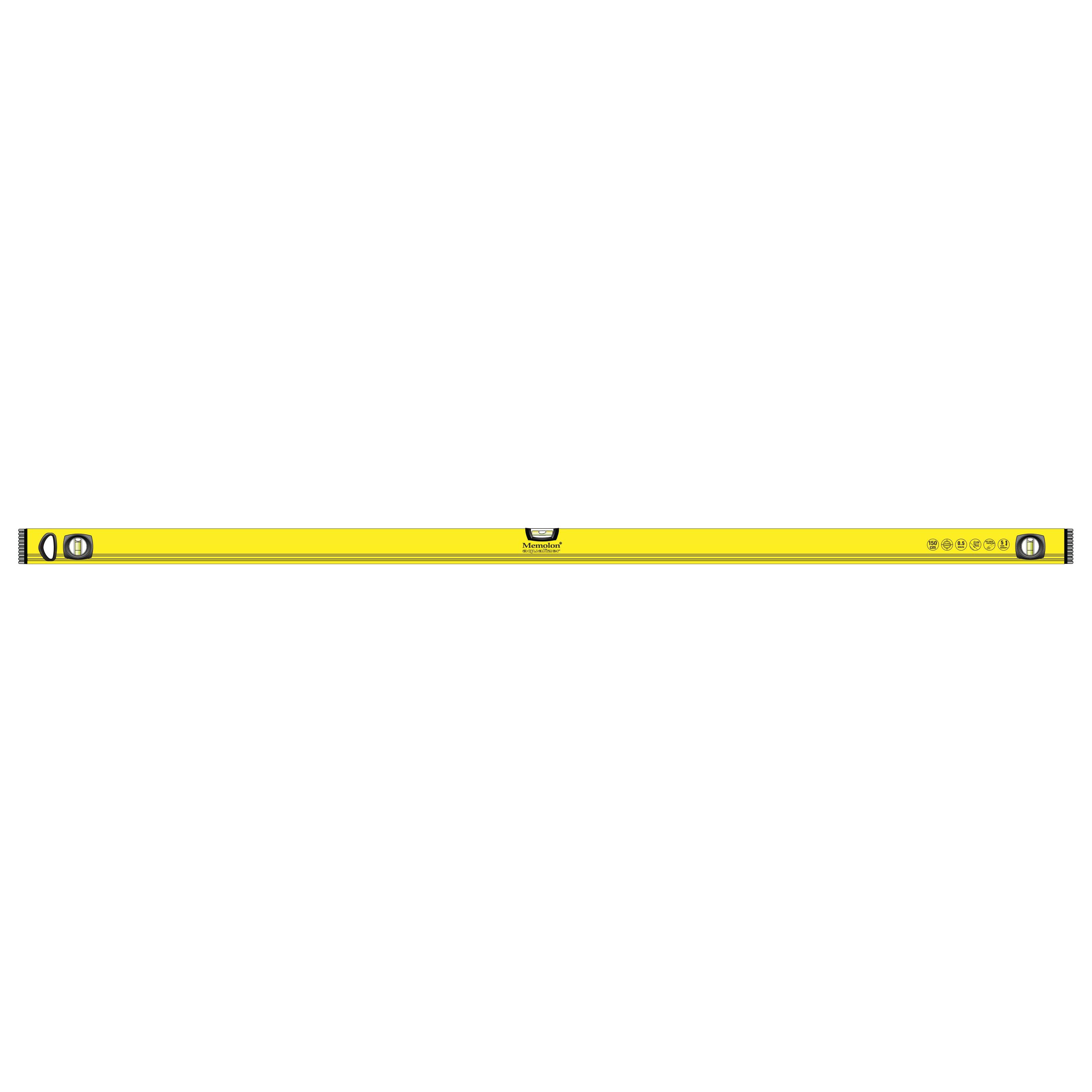 Waterpas Memolon Aqualizer, geel gecoat aluminium kokerprofiel, kunststof stootkappen aan beide uiteinden, 3 libellen (1x horizontaal, 2x verticaal), zonder stelvoetjes.
