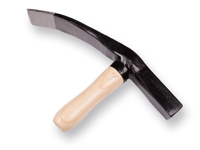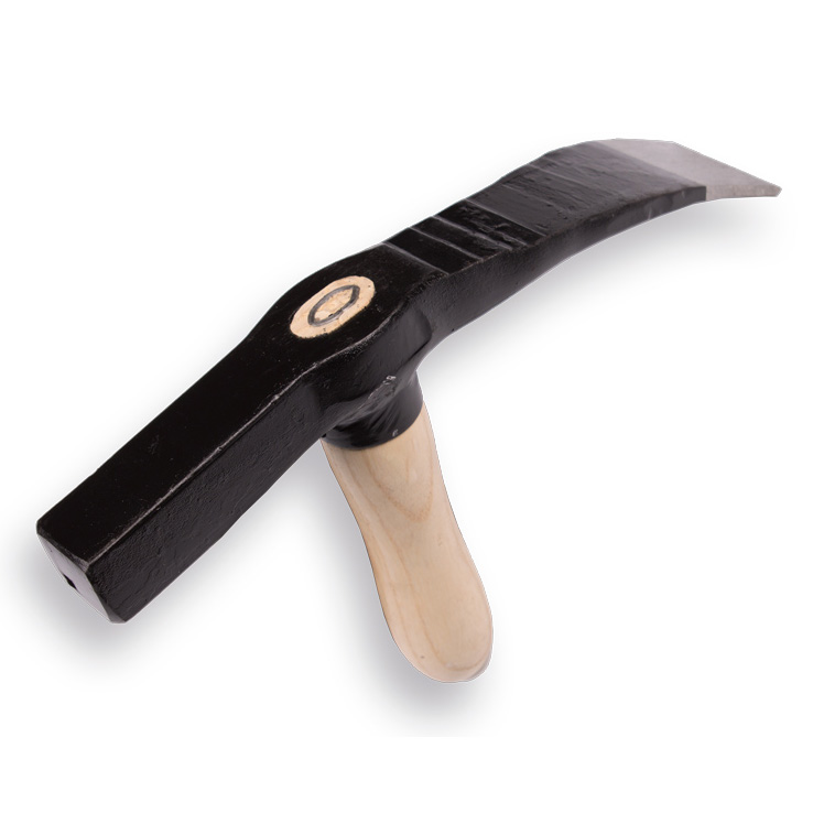 Gesmede straathamer of klinkerhamer, voorzien van een getailleerde Essenhouten steel van 13 cm. De gebogen platte kant heeft een bekbreedte van 5 cm, de rechte zijde heeft een kopmaat van 3 x 3 cm, merk Labora.