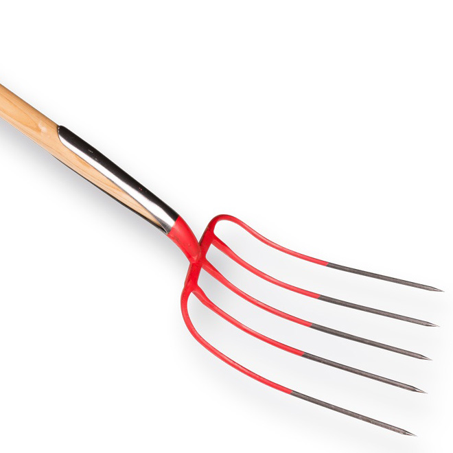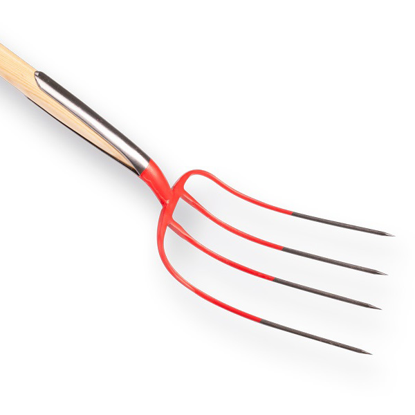 Mestvork of riek met aangesmede dubbele veren, 4 tands, kleur rood, compleet met essen T-steel van 90 cm, merk Offner. Dankzij de dubbele veren is de verbinding tussen de steel en de vork zelf extra sterk. Dit maakt de riek geschikt voor zwaar gebruik.