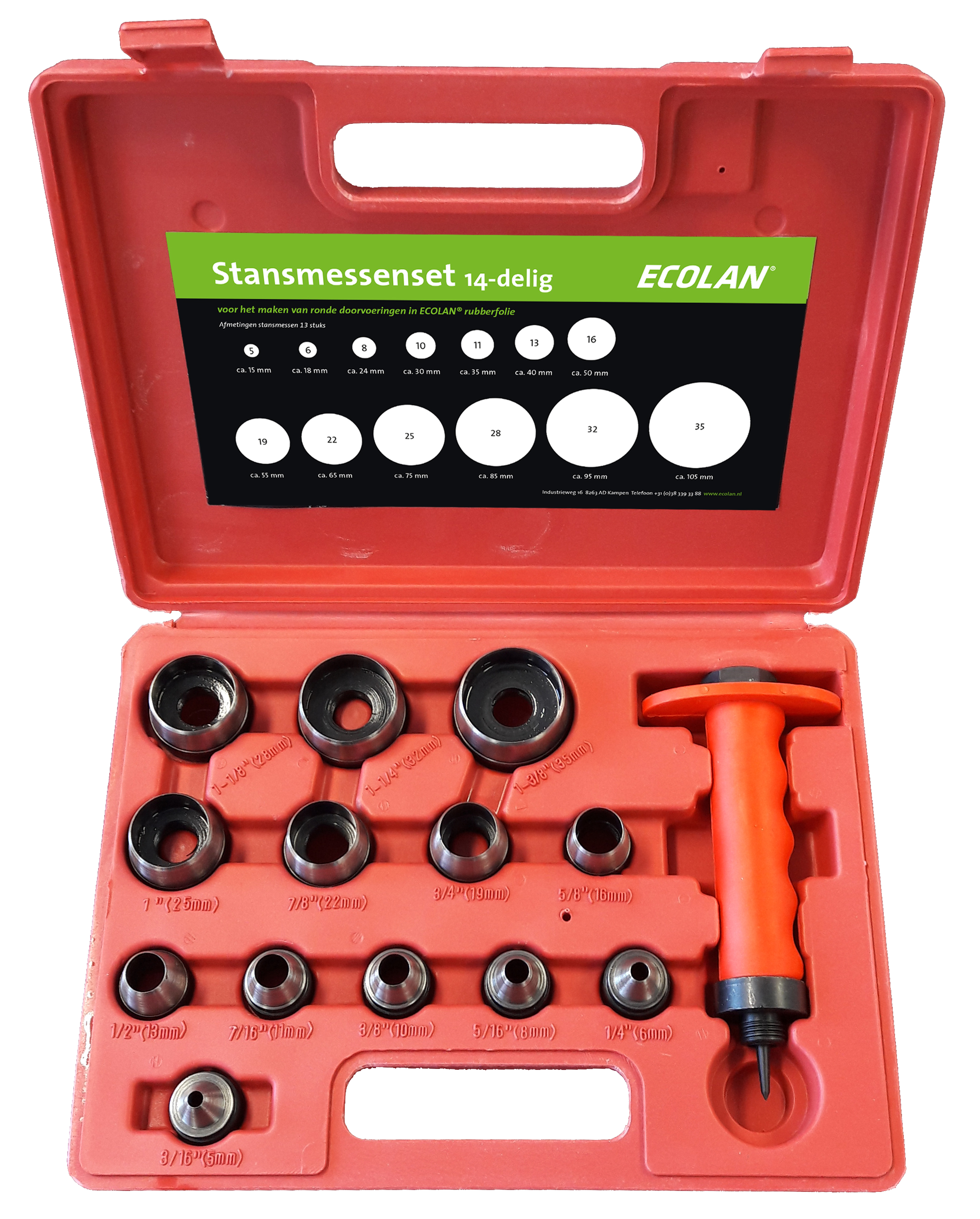 Ecolan 9-delig stansmessenset, voor het maken van foliedoorvoeren van Ø 15 t/m 95 mm.