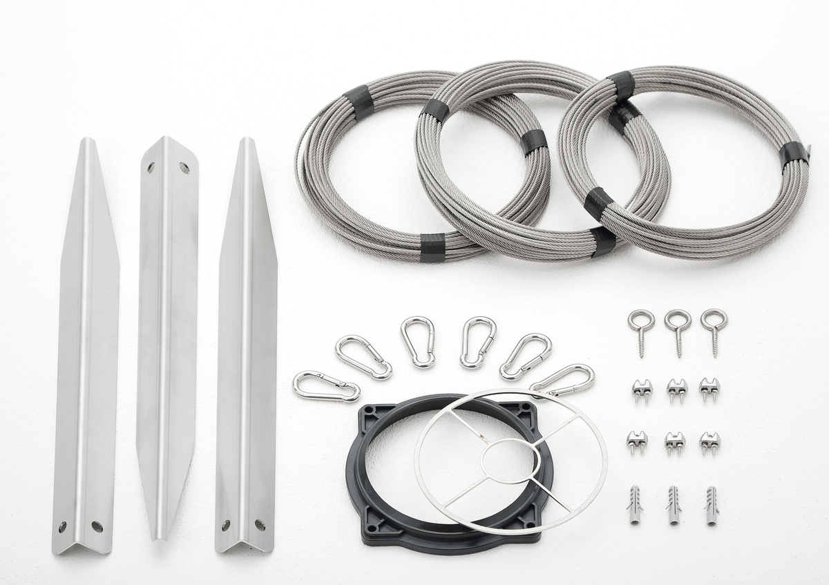 – Meegeleverd bevestigingspakket met 3 staaldraadkabels van 30 m